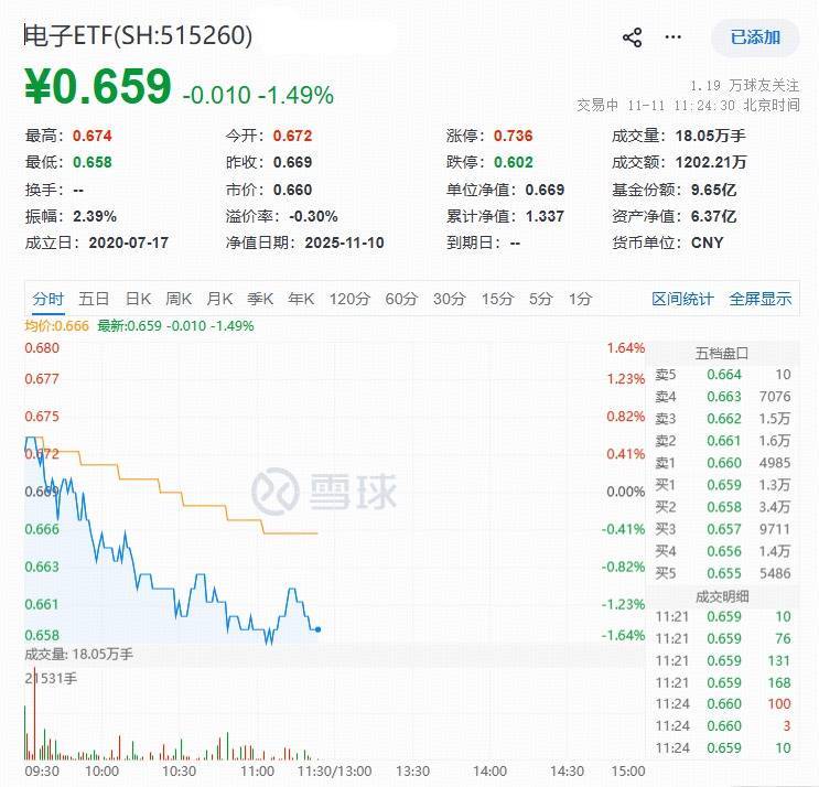 盘面上,今日(11月11日)科技自主可控方向继续随市盘整,存储芯片局部活跃,江波龙领涨超11%,兆易创新一度涨逾3%,布局电子板块核心龙头的电子ETF(515260)场内价格现跌1.49%。