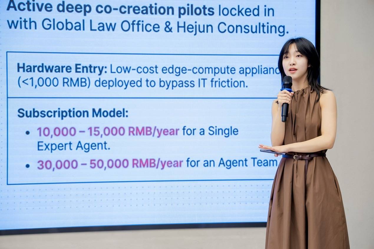 中国AI创业公司ComindX联合创始人张歆然,带来了企业“专属AI员工”方案——她的项目旨在为企业用户提供安全、个性化的人工智能服务,保障其数据安全。她介绍,该项目可节省用户在该领域80%的工作时间,未来计划在咨询、金融等领域推出定制化AI助手。